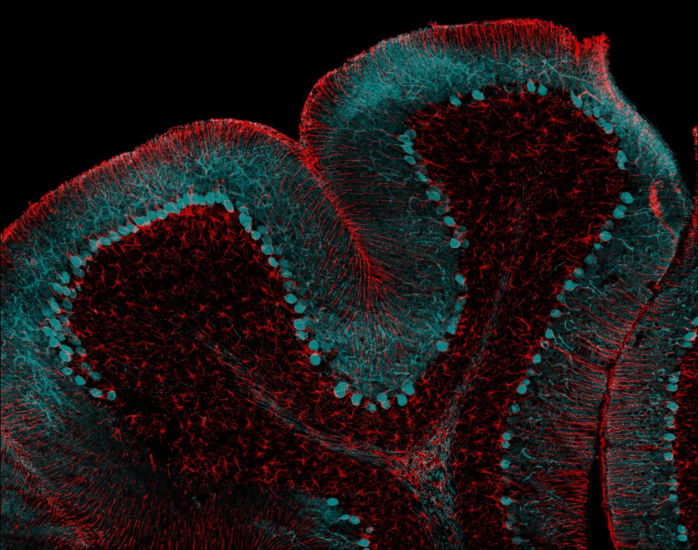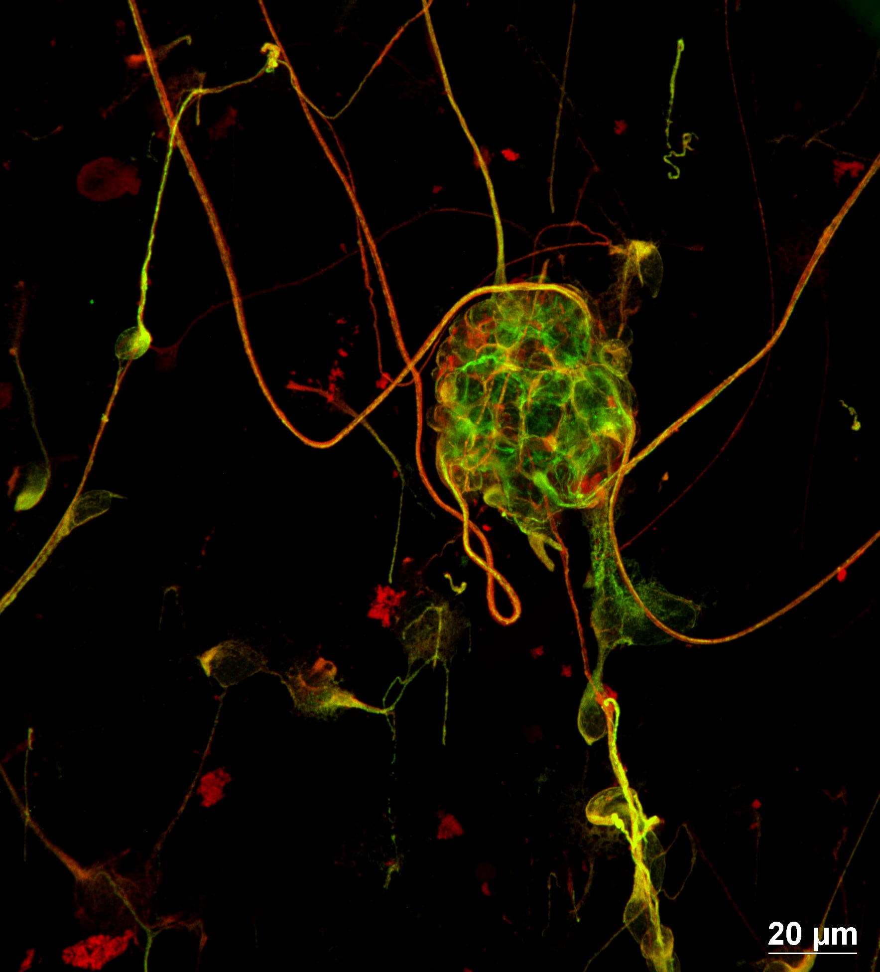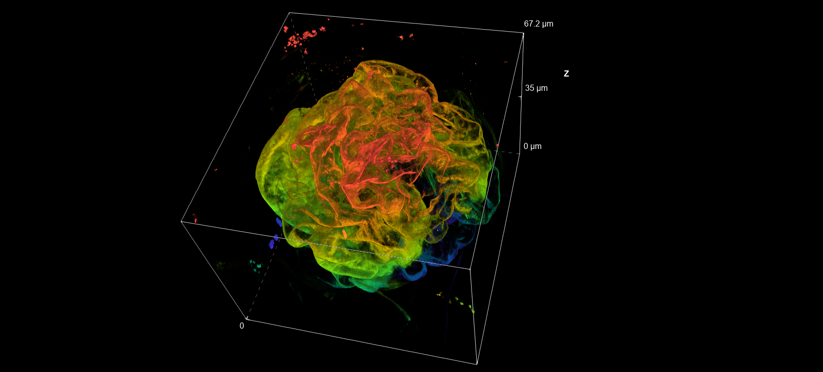 Cortical organoid. MIP of a large image. Dual channel and Z stack acquisition. 20x Air.
