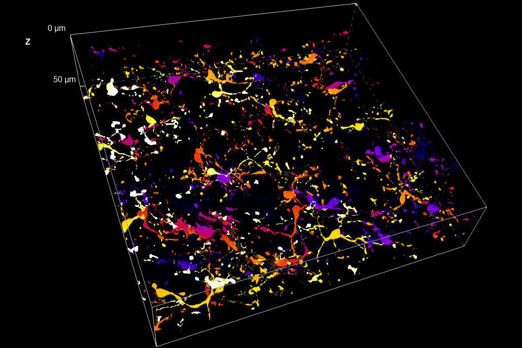 Cleared mouse brain tissue section. 3D volume movie of a 120 microns Z stack. 60x Oil.