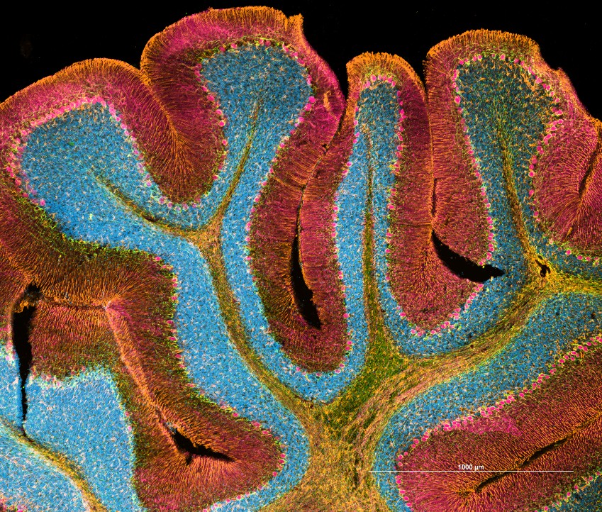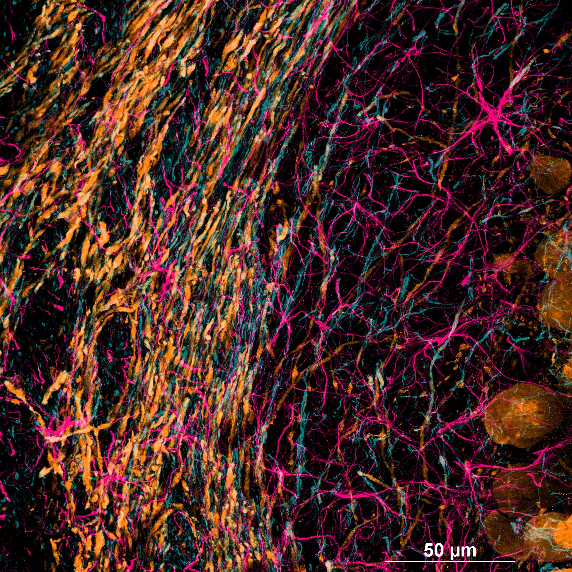 Rat brain tissue section. MIP of a large and multichannel acquisition. 20x Dry.