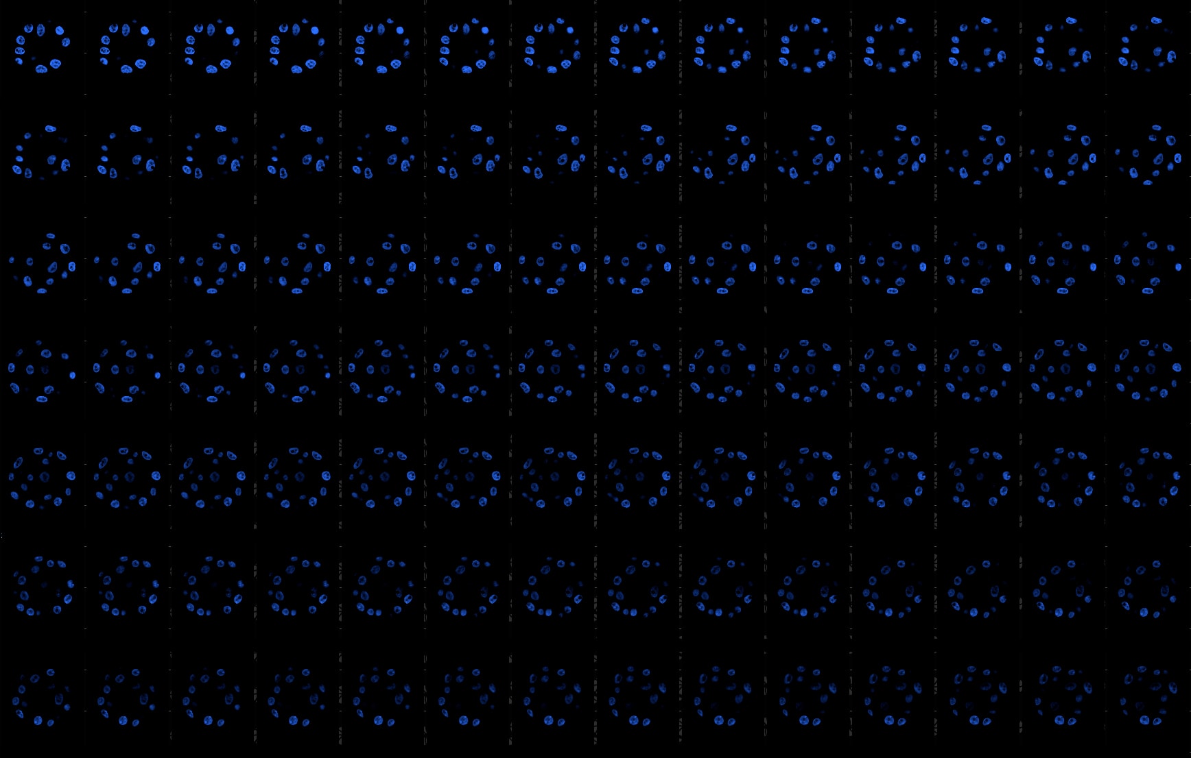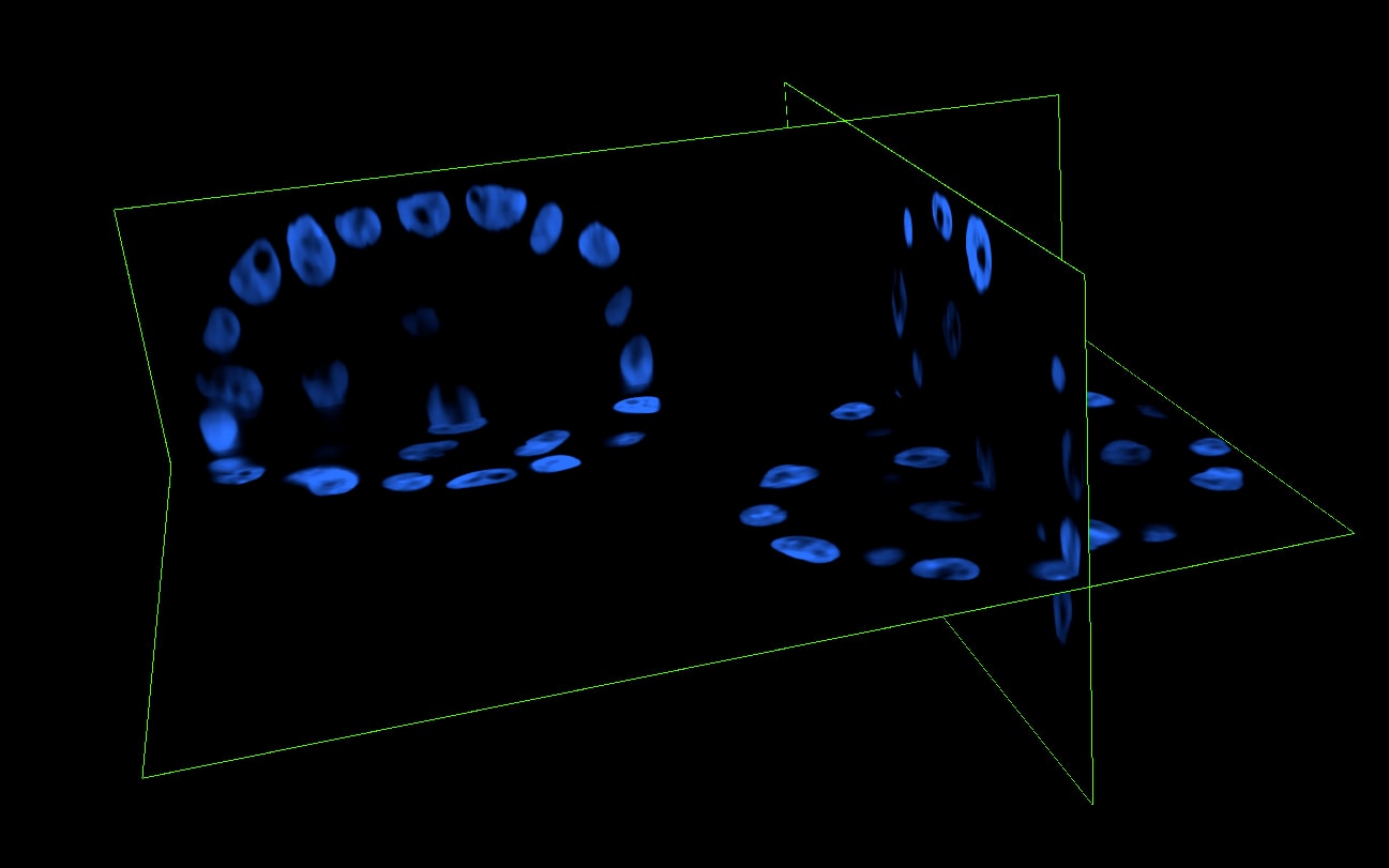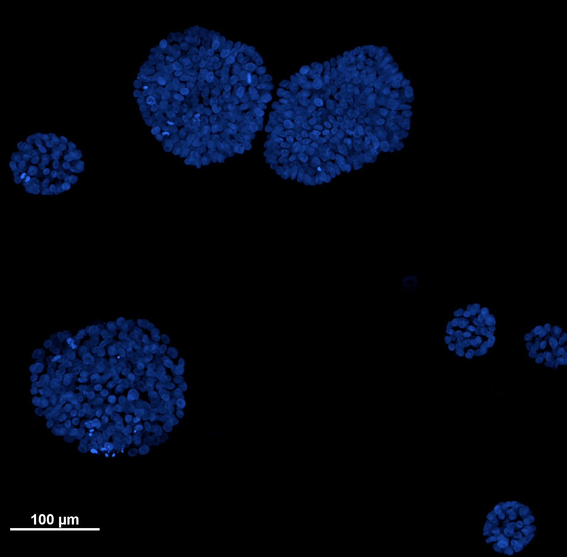 Here we show mammary epithelial cells grown in 3D. In particular, MCF-10A cells (an immortalized non-transformed human epithelial cell line derived from the breast tissue of a 36-year-old patient with fibrocystic changes) has been grown for 7 days in culture medium HUMEC with 2% Matrigel (for further method details see Debnath et al.,Methods, 2003) and subsequently stained by Hoechst 33342 to visualize nuclei. Under these growth conditions, 3D organized and polarized acinar units have been formed starting from single cells seeded on a basement membrane gel. Noteworthy, in literature it has been reported that this 3D epithelial culture method helps to recapitulate numerous features of breast epithelium in vivo, such as the formation of acini-like spheroids, cell polarization, and, in some cases, the production of milk proteins. Moreover, it provides an important tool to characterize how cancer genes disrupt glandular architecture during carcinoma progression.