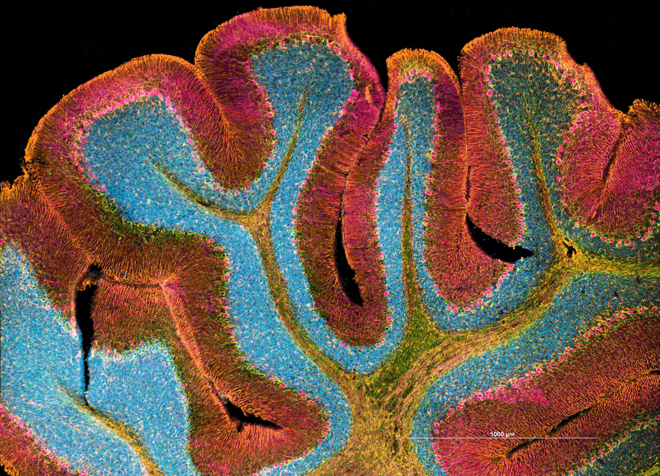 Rat brain tissue section. MIP of a large and multichannel acquisition. 20x Dry.