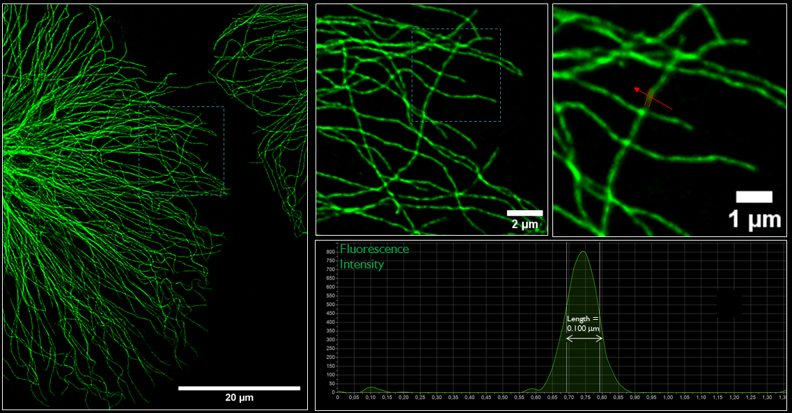 HeLa cells with Oregon Green™ 488 stained tubulin. Two progressive zooms of the area of interest (dotted box) are shown in the upper right boxes. The intensity profile obtained on the tubulin filament under the red arrow is depicted in the graph. 100x Oil, NA 1.45.