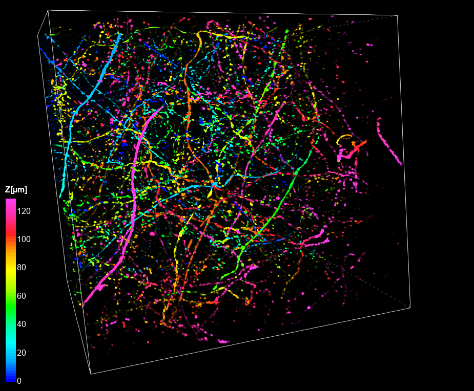 Cleared mouse brain with GFP-neurons is shown in 3D view depth-code (130 µm). 60x Oil, NA 1.4.