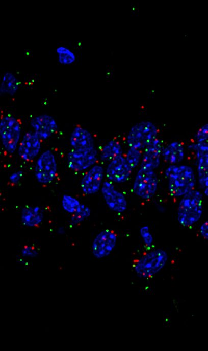 Right: DeepSIM acquisition of a mouse brain section marked with four different RNA species (green, red, cyan and white dots) and nuclei in blue with DAPI. Objective 25X 1.05 NA Silicon oil immersion. Sample credits: Dr. Crevenna, EMBL Rome, Italy. For the related Application Note, please click here.
