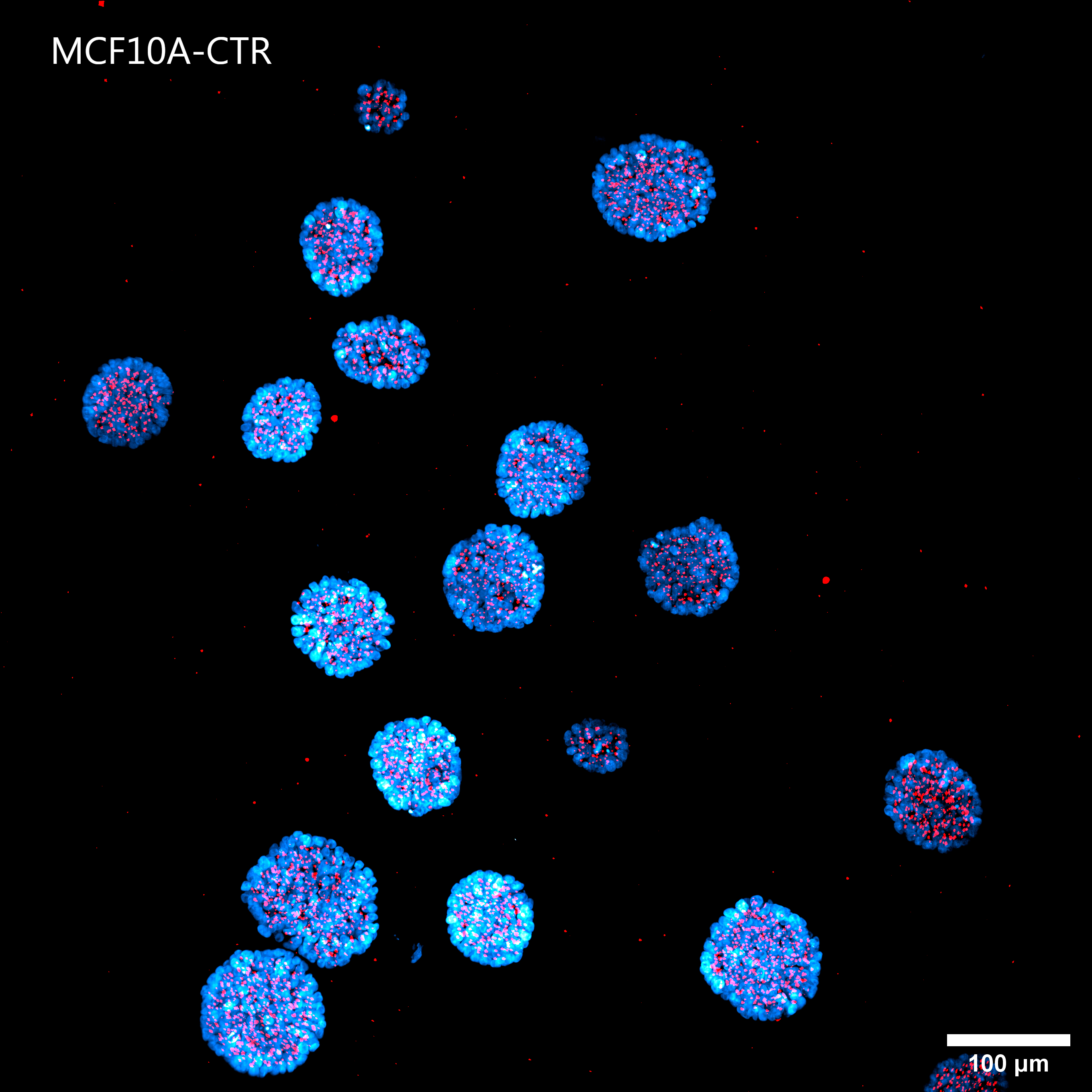 Figure 2 shows two representative early stages (three days in vitro, DIV 3) non-malignant acini grown in 3D Matrigel suspensions. Tubulin (green) identifies the skeleton and therefore the structure of the spheroid, while pericentrin (red) identifies the correct orientation of the mitotic spindle and, therefore, the symmetry of cell divisions within the spheroid.
