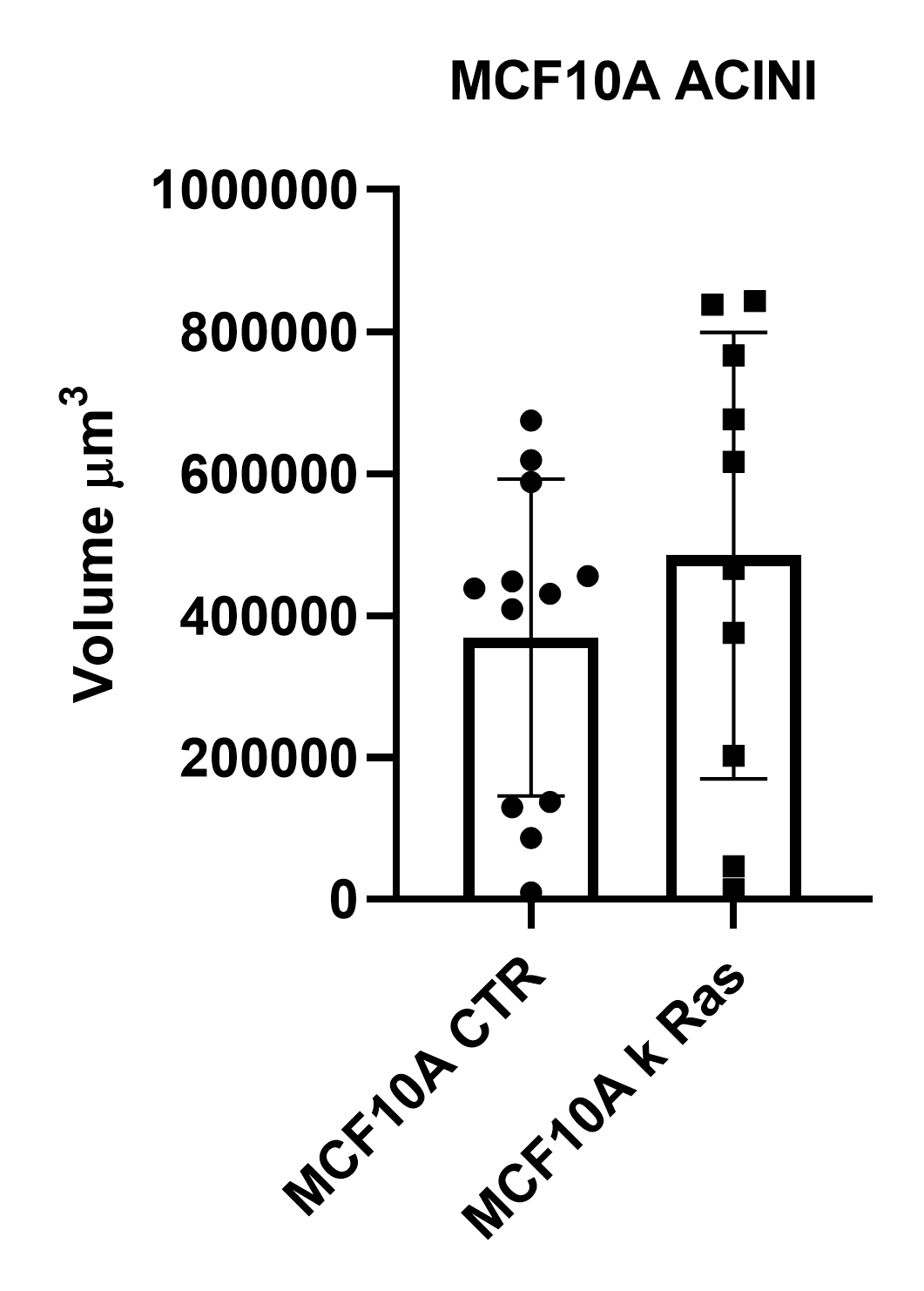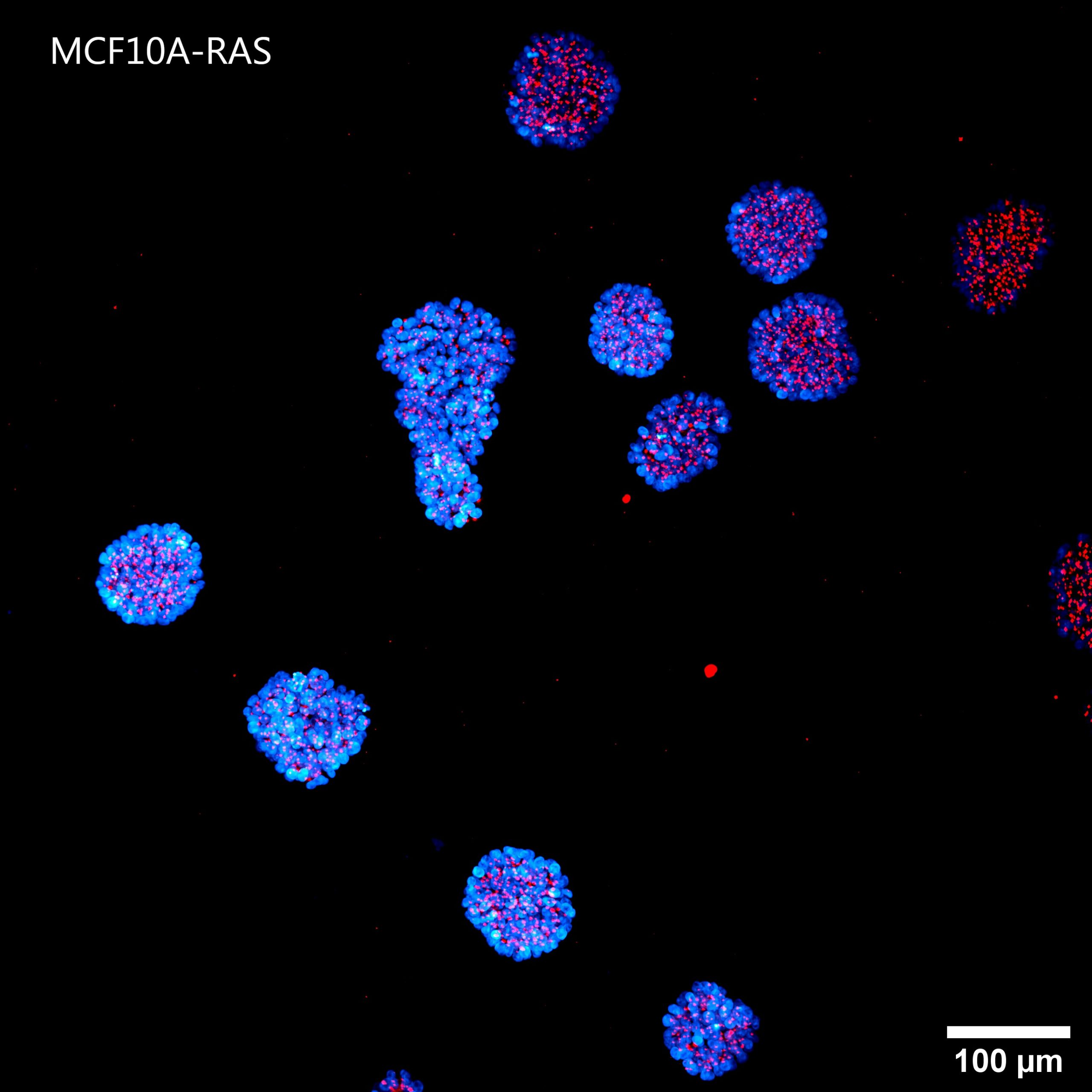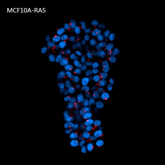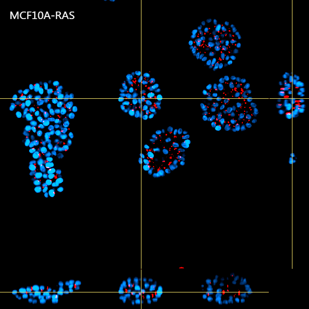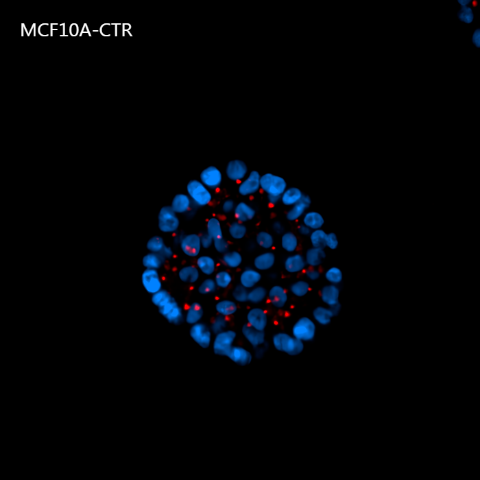 Figure 8: Representative MCF10A-CTR and MCF10A-RAS acini (A) and volume analysis (um3) (B). Cells were cultured in 3D Matrigel suspensions and stained with pericentrin (red) and DAPI (blue). This image was acquired with a CFI Plan Apochromat Lambda D 20x air objective (20x, Nikon, 0.8 NA and 0.8 mm WD). Volume comparison between MCF10A-CTR and MCF10A-RAS acini (B).