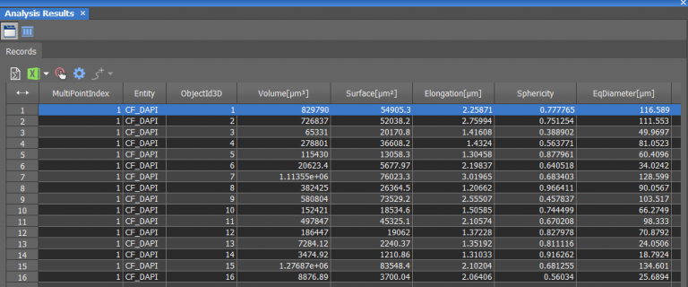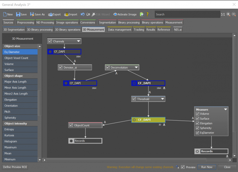 Morphological studies of the acinar structures were accomplished using NIS-Elements General Analysis (GA3), an analysis pipeline with artificial intelligence (AI) capabilities. The combination of multiple conventional segmentation tools and AI techniques can enable customized measurements tailored to specific experiments, and this can be employed across high-content datasets as well. As represented in Figure 7A, we created an analysis pipeline based on five steps: Denoising, Deconvolution, Thresholding, Object counting and Measurements. The previously acquired high-content data can be automatically analyzed using this procedure, obtaining information about volume (um3), surface (um2), elongation (um), sphericity and diameter (um), allowing us to gain more insight into the morphological characteristics of 3D breast cultures (Figure 7B).
