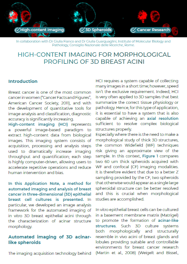 This Application Note describes high-content platforms, based on the CrestOptics X-Light V3 spinning disk, applied to the morphological profiling of 3D breast culture spheroids derived from the MCF10A cell line (immortalized epithelial cells deriving from breast tissue with fibrocystic alterations). Structural features of mammary acinar cultures were investigated in non-malignant, non-invasive cancer cells (MCF10A-CTR), as well as malignant and invasive cancer cells (MCF10A K-Ras), a line created by engineering control cells for the stable expression of the small GTPase Ras oncogenic mutated form (K-Ras).