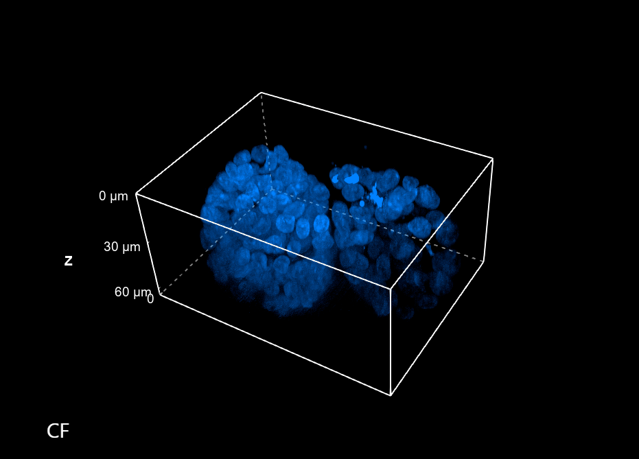 Figure 1: Comparison between WF and CF spinning disk volume views of 60 um spheroids. These images were acquired with a CFI Plan Apochromat Lambda D 60x oil objective (60x, Nikon, 1.42 NA and 0.15 mm WD).