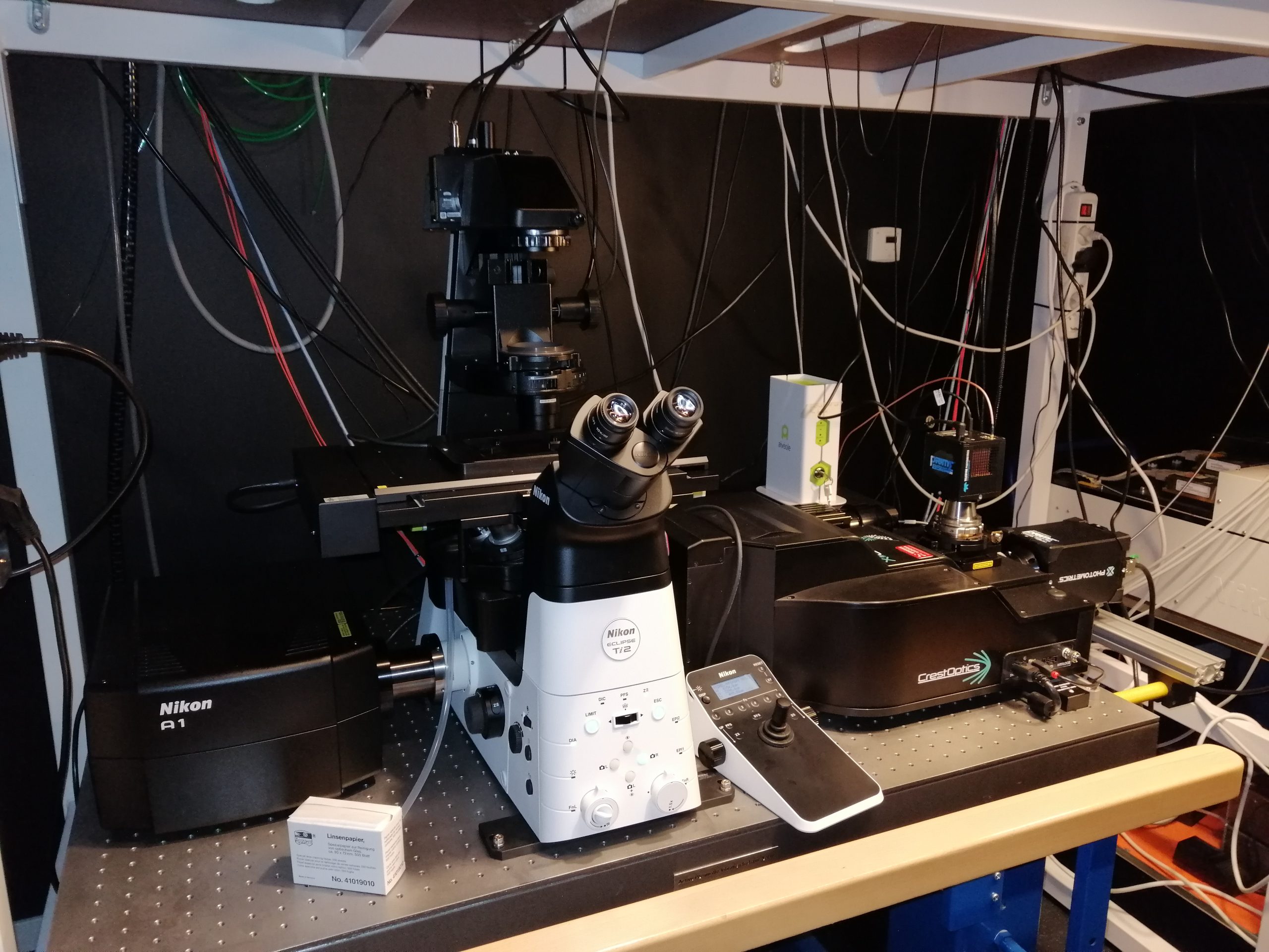 Our system consists of a Nikon Ti2 equipped with X-Light V3 spinning disk on one port and a single point confocal on the other port. This allows us to combine different imaging modalities. Recently, we upgraded the system with a CO2- and temperature-controlled incubator to enable imaging live samples.