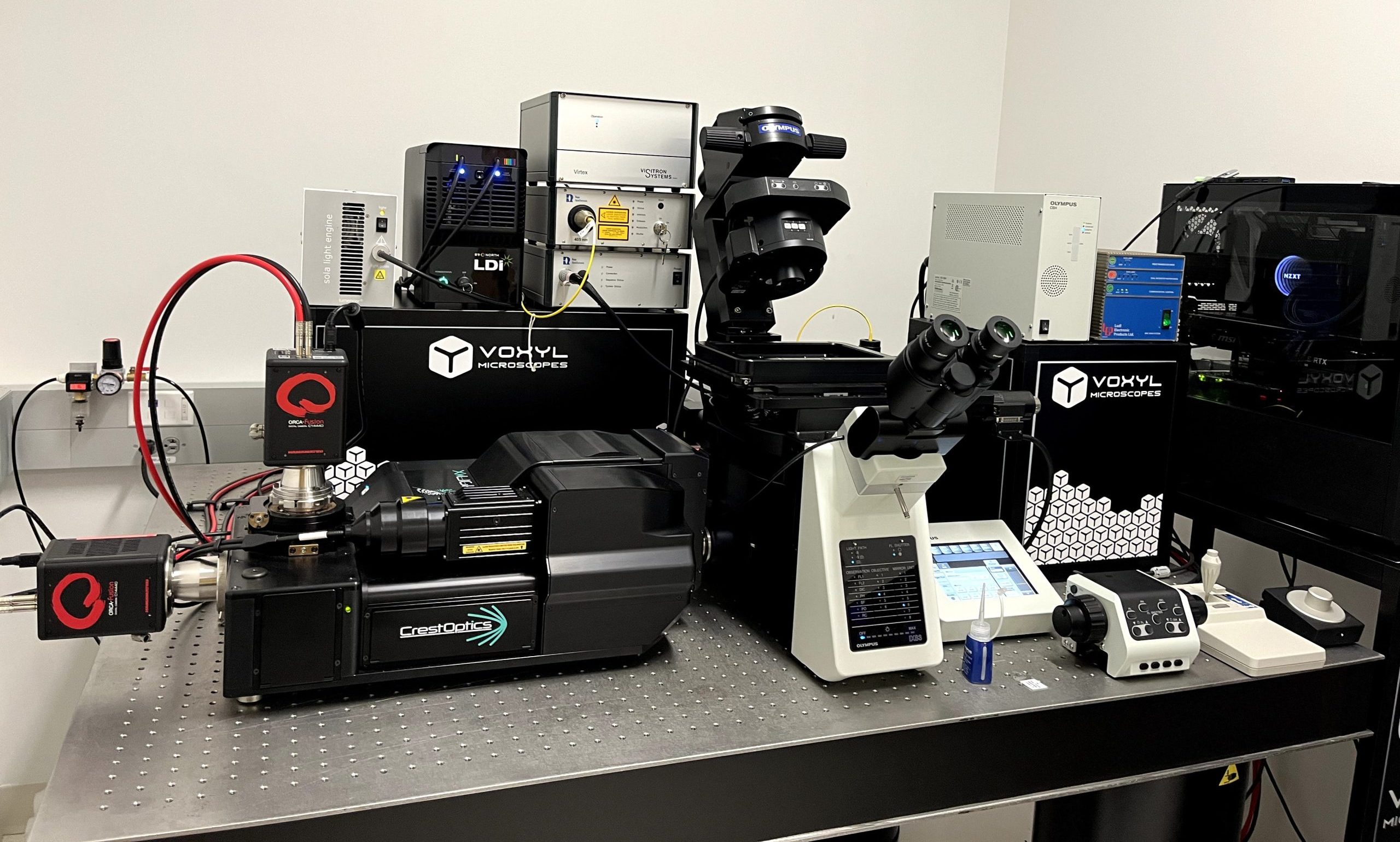 We have an X-Light V3 mounted to the side port of a IX83 body (Olympus). We are currently using two ORCA Fusion 2 cameras (Hamamatsu), a 6-line LDI laser system (89 North), and Ludl stage with a piezo insert. Moreover, the system is equipped with RapOptics and Visitron controller for FRAP with a 405 Laser. All devices are driven by Visiview software.