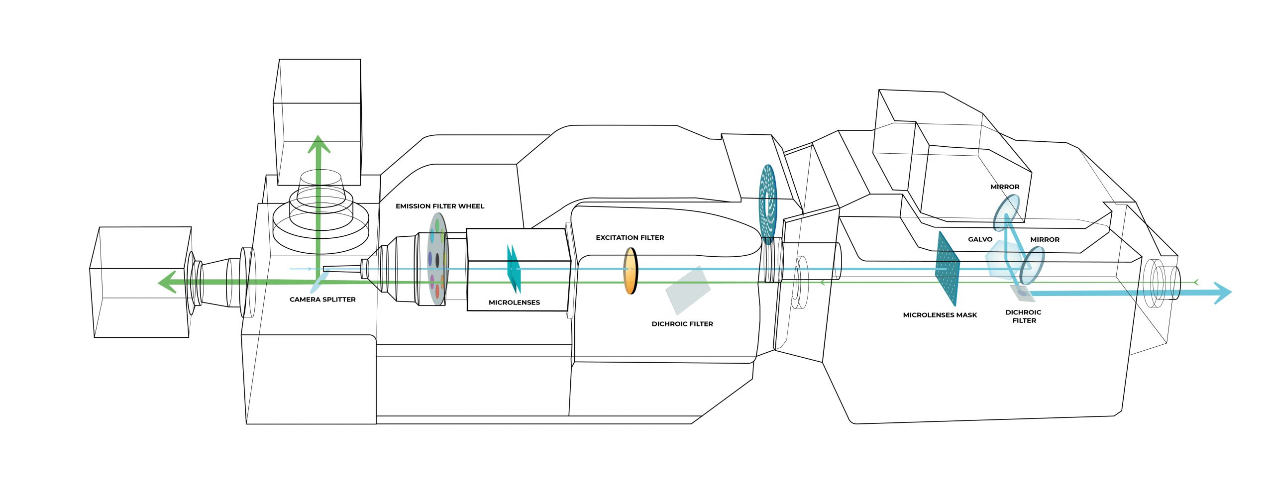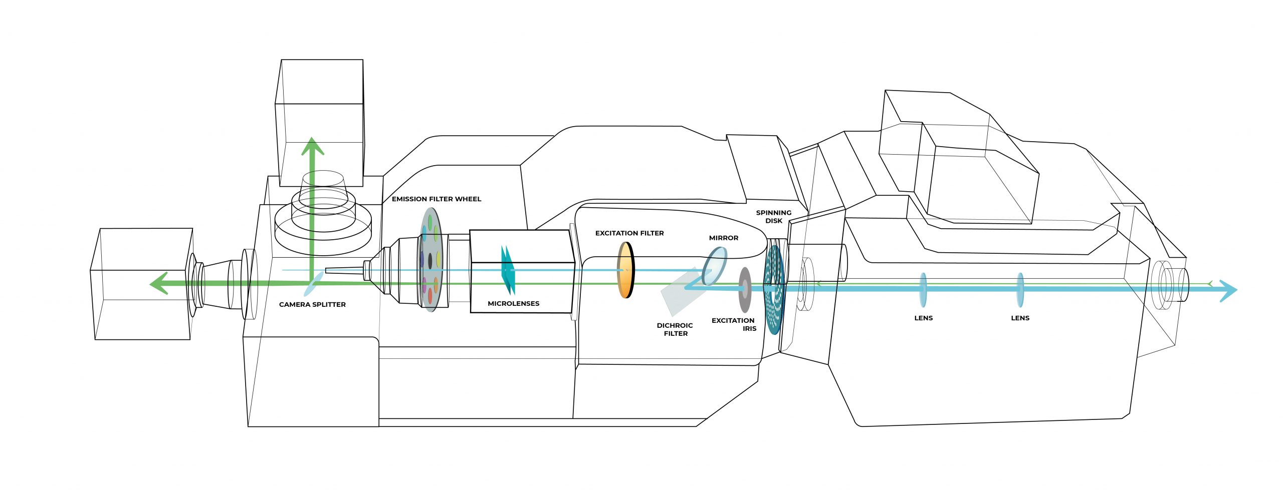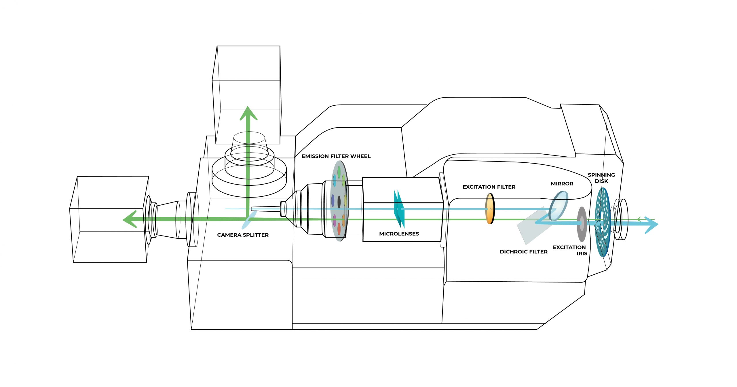 Figure 1: Schematic diagram of the X-Light V3 spinning disk confocal. Laser light enters the V3 via a multi-mode fiber, passes through the microlenses array and the excitation filter wheel; collimated light is then focused through the pinholes of the disk to the sample. Emission light coming from the sample goes through a dichroic mirror, emission filters and the selected emission frequency is detected by the camera.
