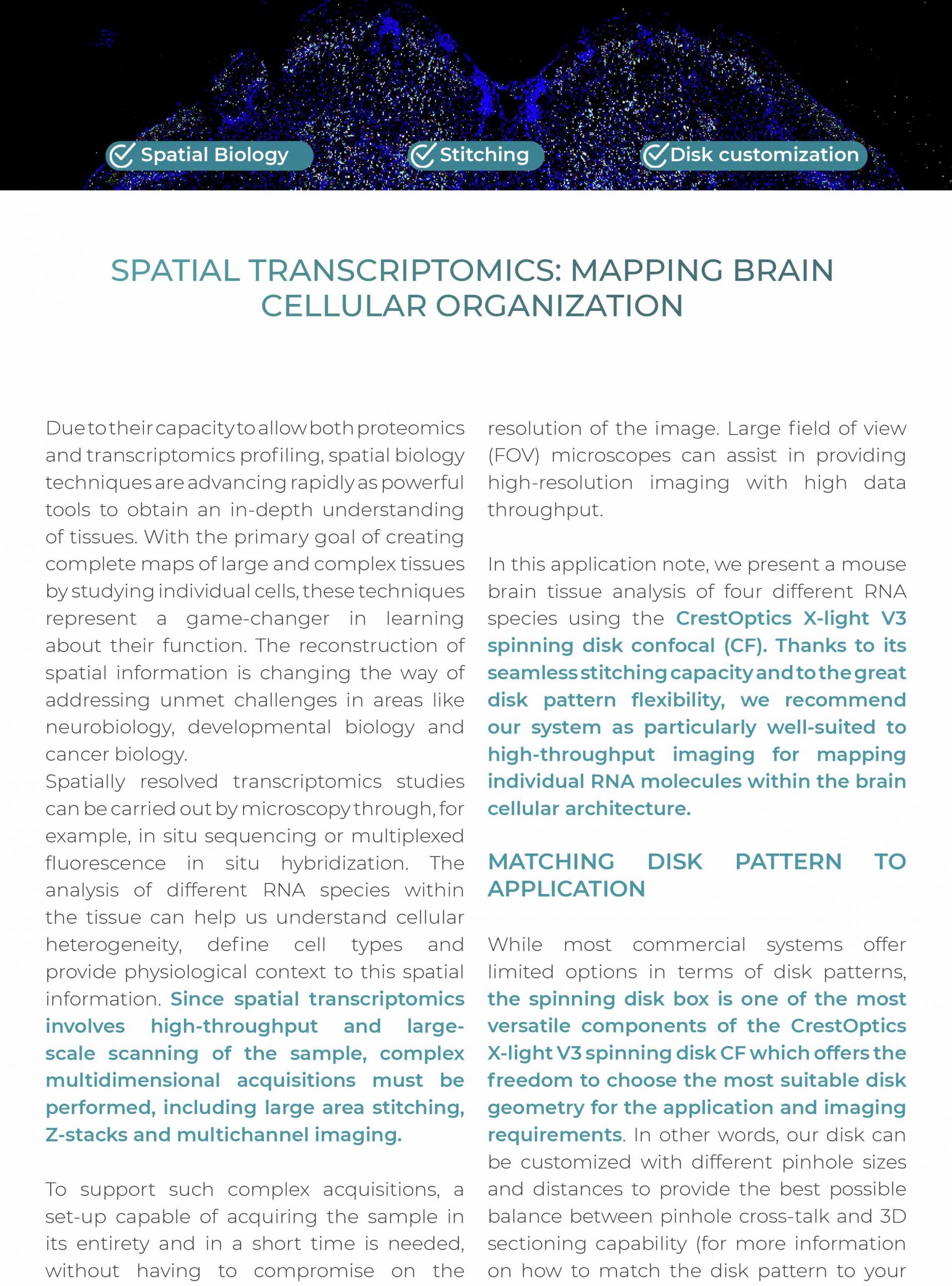 In this application note, we present a mouse brain tissue analysis of four different RNA species using the CrestOptics X-light V3 spinning disk confocal (CF). Thanks to its seamless stitching capacity and to the great disk pattern flexibility, we recommend our system as particularly well-suited to high-throughput imaging for mapping individual RNA molecules within the brain cellular architecture.