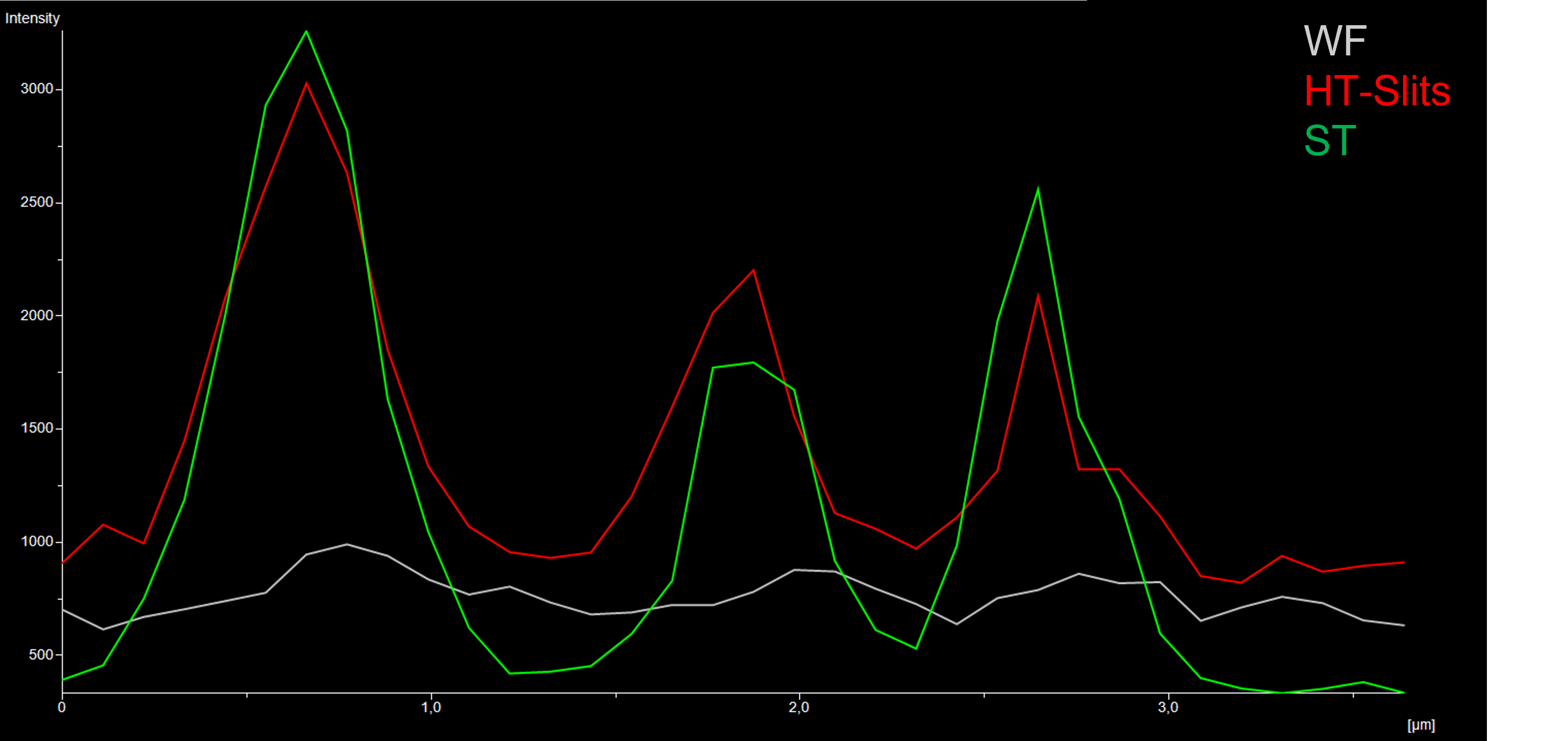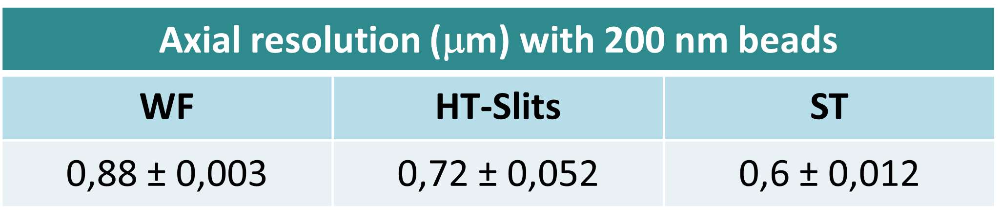 Altogether these data demonstrate that there is a significant improvement in the axial resolution using CF approaches. The comparison between HT-Slits and ST disks 60X acquisitions shows that an excellent level, in terms of image quality and confocality, can also be achieved with the HT-Slits. At the same time, the slits pattern allows to obtain a good trade-off with the throughput of the system, meaning that a sufficient level of light can be collected from the specimen, therefore enabling high-speed and high-resolution acquisitions.