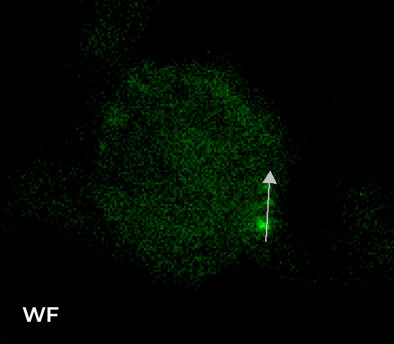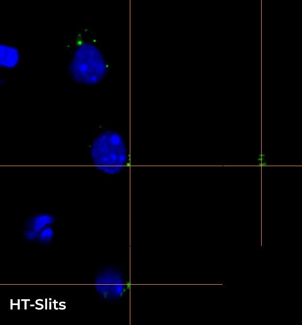 Figure 5 shows a comparison between WF and CF images, focusing on a single cell and a single Z plane (8 um inside the sample). As demonstrated by these images, the use of a CF acquisition modality clearly improves the sectioning in Z; moreover, the intensity profiles related to 3 single RNA dots prove that the use of the HT-Slits disk allows obtaining a similar image quality with respect to that achieved with the ST disk.