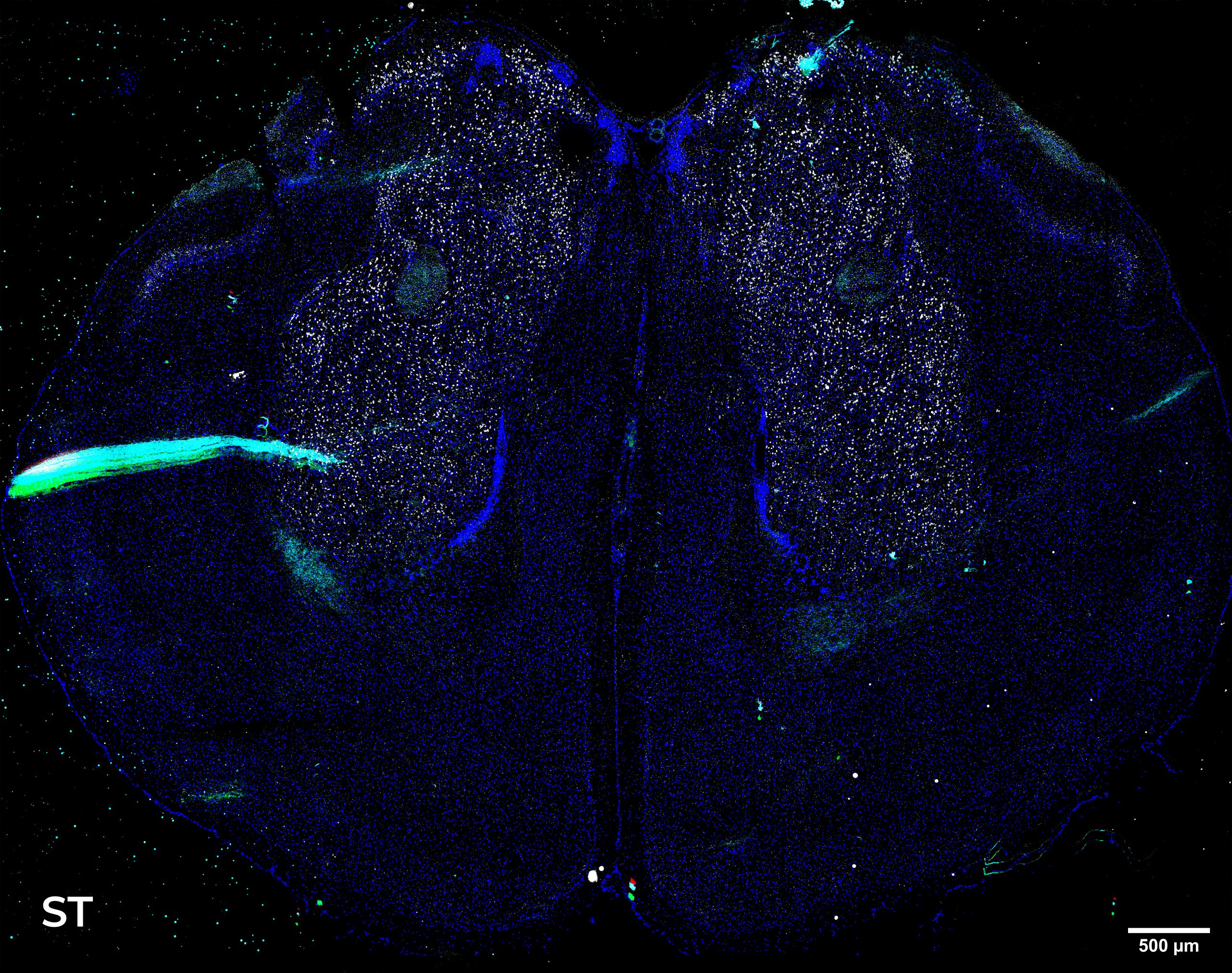 Figure 2: Comparison between HT-Slits disk (top) and ST disk (bottom) acquisitions. Large images of a mouse brain section marked with four different RNA species (green, red, cyan and white dots); single cell nuclei are stained in blue. These images represent intensity projections of a mouse brain slice acquired with a CFI Plan Apo Lambda 20X air objective (NA 0.75, WD 1) in a stack with z-step of 0.9 um and with 18 um of Z range. Scale bar: 500 um.