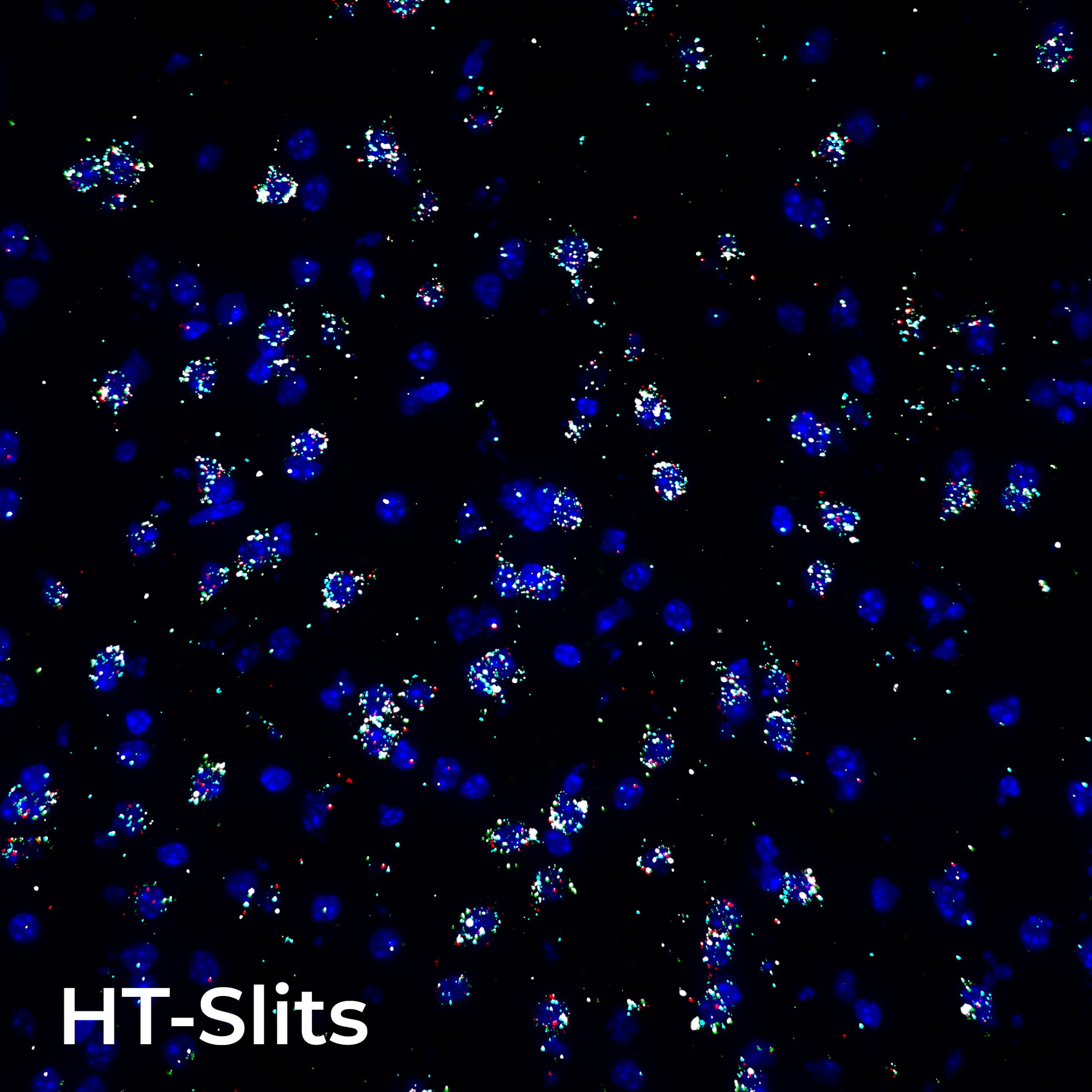 Spatial transcriptomics experiments consist of sequential multi-markers imaging on large and complex samples and here we present the study of individual RNA molecules organization within a mouse brain section. With this purpose, automated image acquisitions, consisting of 80 FOVs and 16 Z-planes (0.9 um steps), were performed for five channels (DAPI for nuclei visualizations and four channels for as many RNA species). The whole-brain slice was imaged with a Plan Apo Lambda 20X air objective (NA 0.75, WD 1) and the same type of acquisition was performed with both ST and HT-Slits disk, comparing acquisition times and image quality (Figure 2).