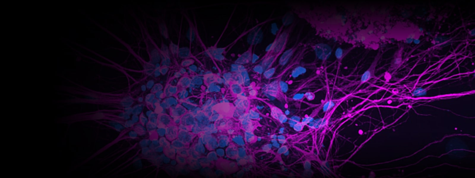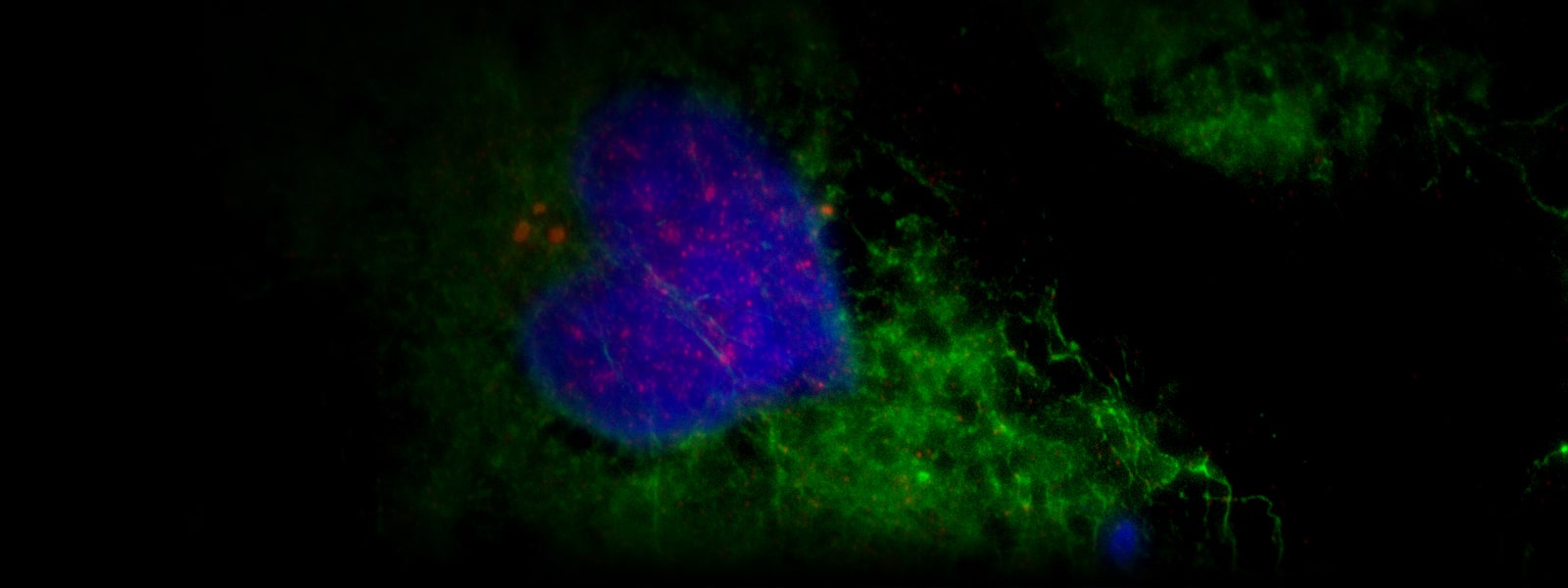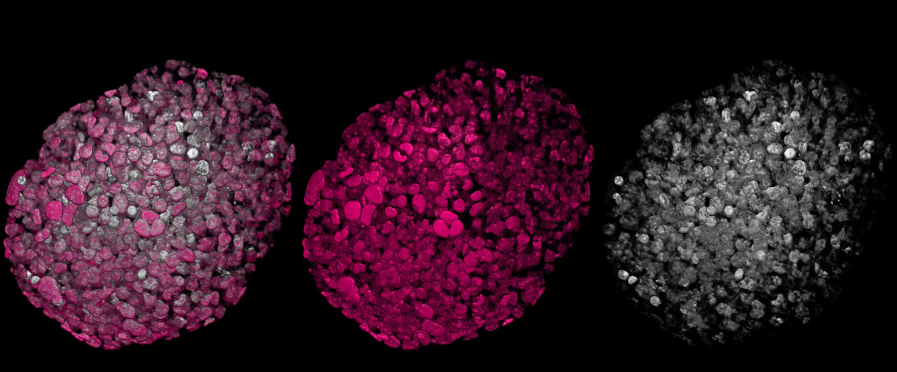 Here we show nuclei in white (Hoechst 405) and NLS (Nuclear Localization Signal) in magenta.