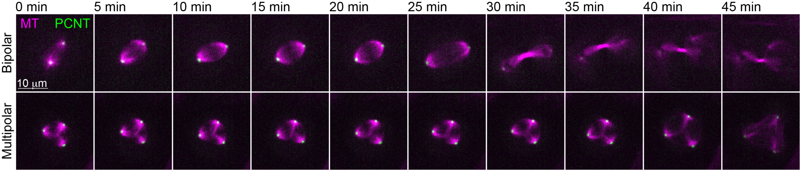 Figure 1: RPE-1 cells expressing mStayGold-PCNT (centrosome) and stained with SiR-tubulin (microtubules) were imaged every 5 min for 18h in 3D. Examples of maximum intensity projections of a normal bipolar mitotic event and an abnormal multipolar division are shown. Scale bar: 10 µm.