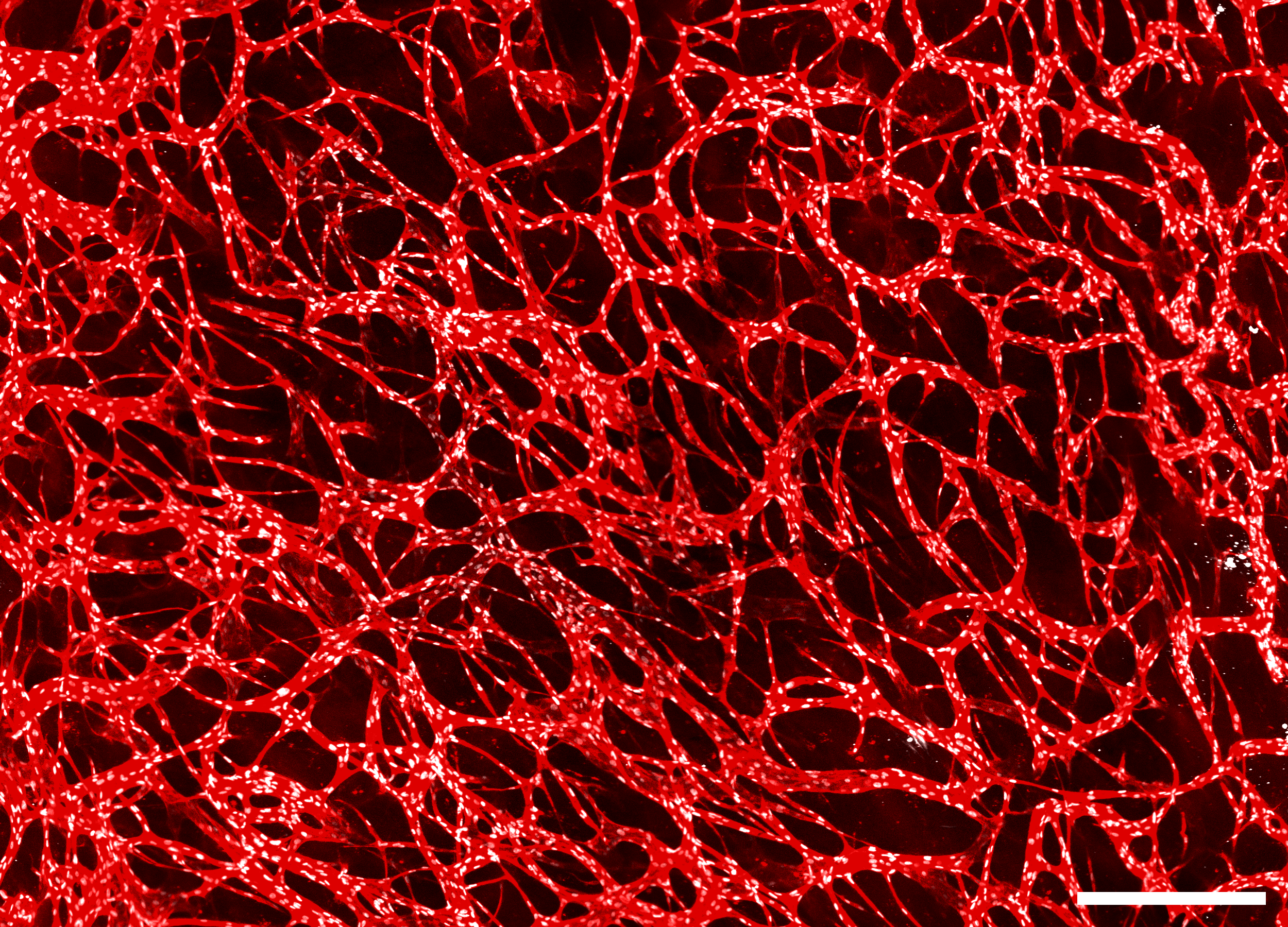 Figure 2: In vitro vascular network imaged on the X-Light V3 system. Red: vessels (CD31). White: endothelial nuclei (ERG). Scale bar: 500 µm.