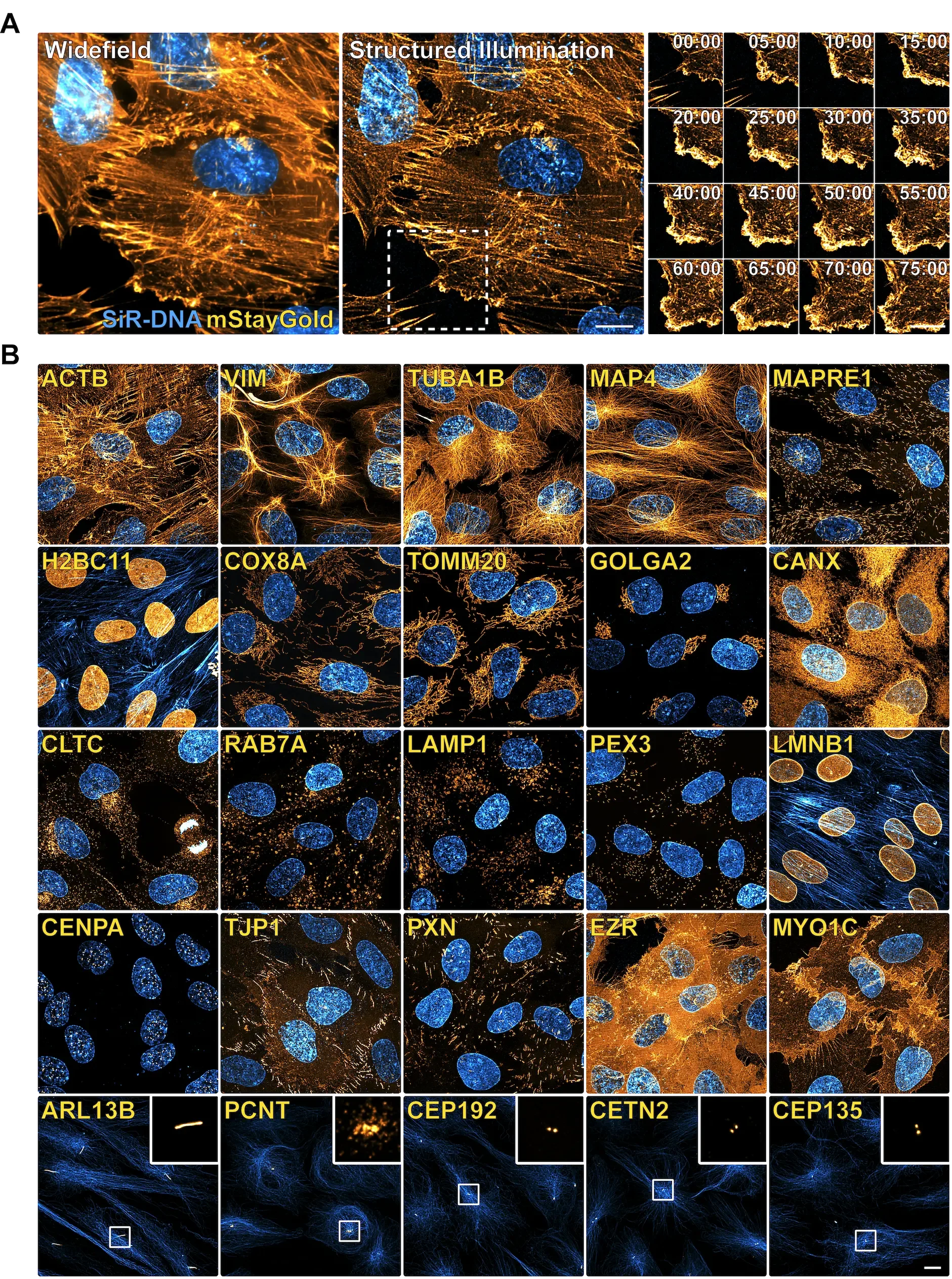 Figure 3: Endogenous mStayGold fusions generated by CRISPR using optimized qTAG donors. (A) Super-resolution timelapse imaging of mStayGold tagged ACTB (Orange) co-stained with SiR-DNA (Blue). (A – Left) – A widefield image at the start of the timelapse. (A – Middle) – The corresponding structured illumination super-resolution reconstructed image. (A – Right) – A time-lapse array of images following the highlighted area. (B) Shown are representative images of 25 genetically edited genes harbouring the mStayGold fluorescent protein sequence (Orange), co-stained with live SiR dyes (Blue) against Actin, Tubulin, or DNA, enabling visualization of their native expression, localization, and dynamics. Imaged via live DeepSIM. Scale bar: 10 µm. (Adapted from Philip et al., 2025. EMBO Journal).